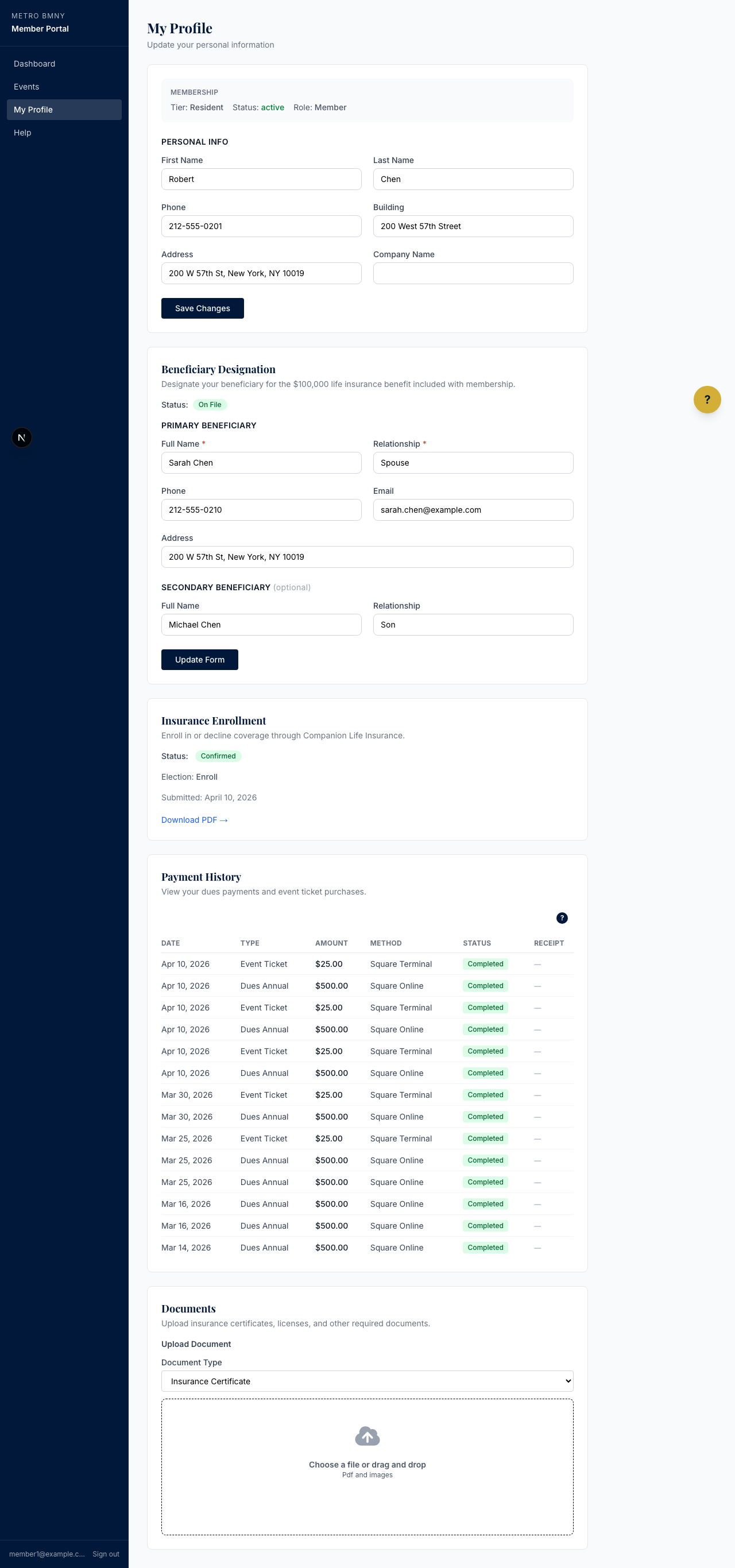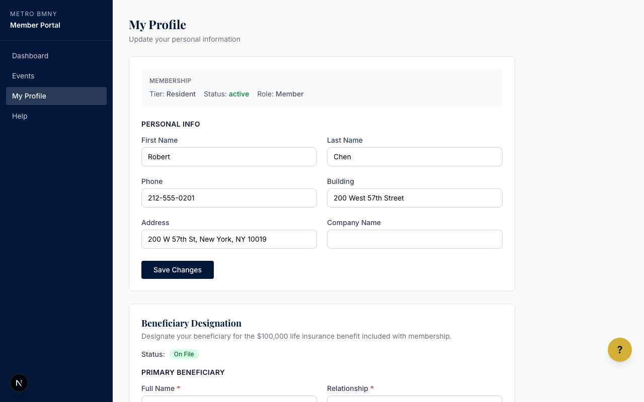 Your profile is how Metro BMNY stays in touch with you. If you move to a new building, change your phone number, or update any personal detail, please keep your profile current. This makes sure you get meeting reminders, payment notices, and emergency updates.